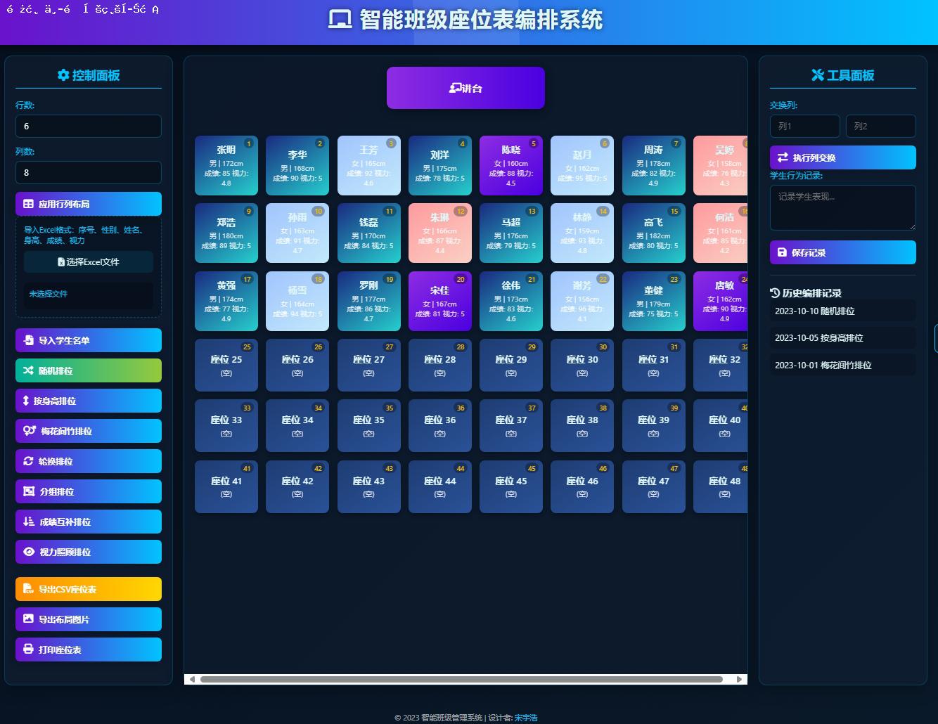 这个座位表编排系统包含以下功能:1. Excel导入功能:点击"导入Excel名单"按钮可导入学生数据(格式:序号、性别、姓名、身高)2. 随机排位:完全随机打乱学生座位顺序3. 按身高排位:按身高排序并男女相间排列4. 梅花间排序:按男女梅花间模式排列(男女交替)5. 拖拽调整:直接拖动学生座位到新位置进行交换6. 列交换功能:输入两列序号后交换整列学生7. 导出座位表:导出为CSV格式的详细座位信息8. 导出布局图:将当前座位布局导出为PNG图片9. 打印功能:打印A4纸格式的座位表使用说明1. 系统