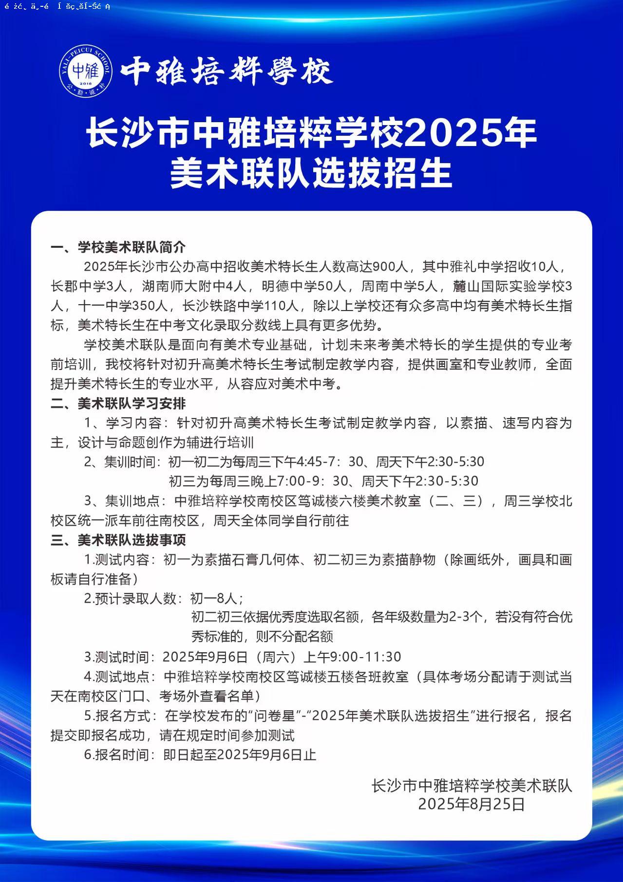 亲爱的2025级中雅少年:“子所雅言,诗书执礼”,中雅校园书香四溢。这里有五育并举的特色课程,有精彩纷呈的校园活动,有博学善教的良师益友。这里将是你们梦想启航、希望飞扬的沃土。愿你们矢志前行,不懈奋斗,成就更卓越的自己,书写最绚丽的青春篇章!为了你能顺利办理入学手续,请务必和家长认真阅读本须知,并按要求做好各项事务。2025级初一新生开学工作时间安排入学准备1.自愿购买校服①请认真阅读《2025年长沙市中雅培粹学校新生校服订购告知函》,按时通过网上平台自愿购买校服。8月22日新生报到及军训期间均建议穿夏季